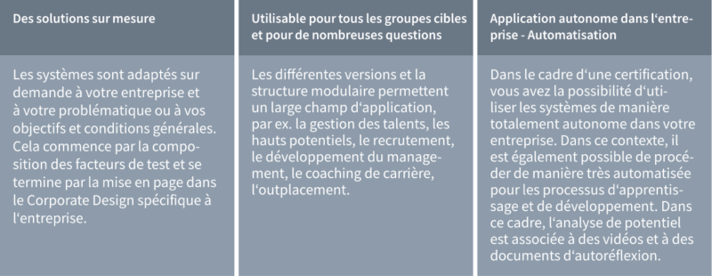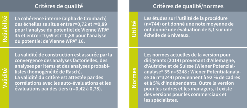Nos analyses de potentiel ont été développées en collaboration avec l’Université de Vienne. La procédure itemmétrique répond aux critères de la théorie moderne des tests probabilistes, elle est continuellement développée et dotée de normes actuelles spécifiques aux groupes cibles. Dans le même temps, de nombreuses années d’expérience pratique dans les domaines concernés ont été mises à profit.