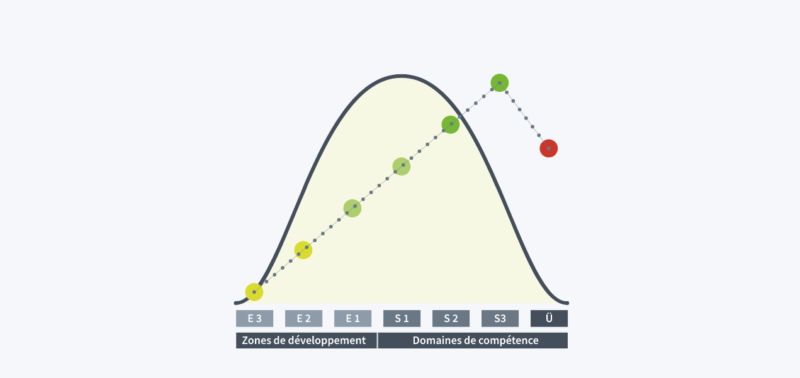 En outre, il existe une auto-évaluation à l’aide de questions bipolaires à la fin de la procédure, qui est calculée directement sans standardisation. Cette deuxième mesure complète la comparaison de l’auto-évaluation avec le groupe de comparaison par le propre étalonnage de la personne, c’est-à-dire par ce qu’elle perçoit comme étant cohérent pour elle-même. Elle peut confirmer ou remettre en question la comparaison avec la norme. Les cohérences et les incohérences (« angles morts » mais aussi orientations de développement) deviennent visibles.
