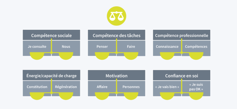 En termes de contenu, nos analyses de potentiel portent sur des équilibres très fondamentaux qui peuvent être facilement combinés avec les valeurs et les lignes directrices de votre entreprise. Elles sont basées sur le modèle des six équilibres (copyright) d’Alfred Lackner. Il s’agit d’un système de classification qui aide à systématiser une grande variété d’exigences professionnelles et à rendre visibles les relations entre elles. Il s’agit d’un modèle d’équilibre et d’un métamodèle. Il décrit les domaines d’exigences pertinents pour l’équilibre des forces opposées. En tant que