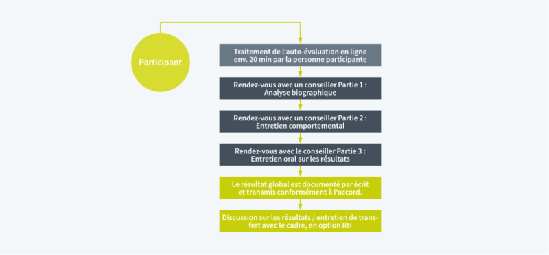 Nous ne nous contentons pas de confier la responsabilité de l’évaluation à un questionnaire. En fonction des exigences et des questions, nous combinons les résultats de l’analyse du potentiel avec les résultats d’autres instruments (analyse biographique, entretiens, nouveau : assessment center) pour obtenir un résultat global. Ce résultat décrit les compétences effectives et le potentiel qui peut encore être développé.